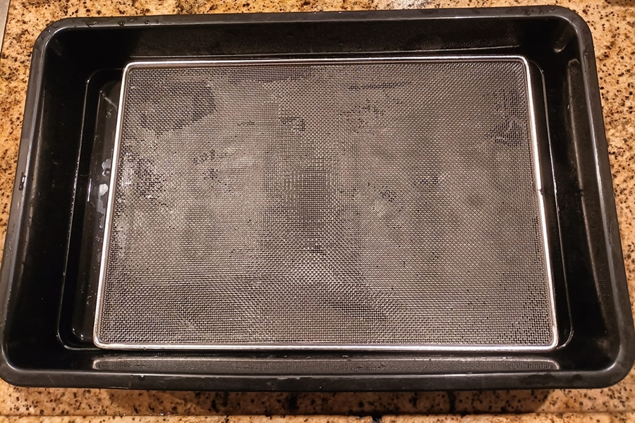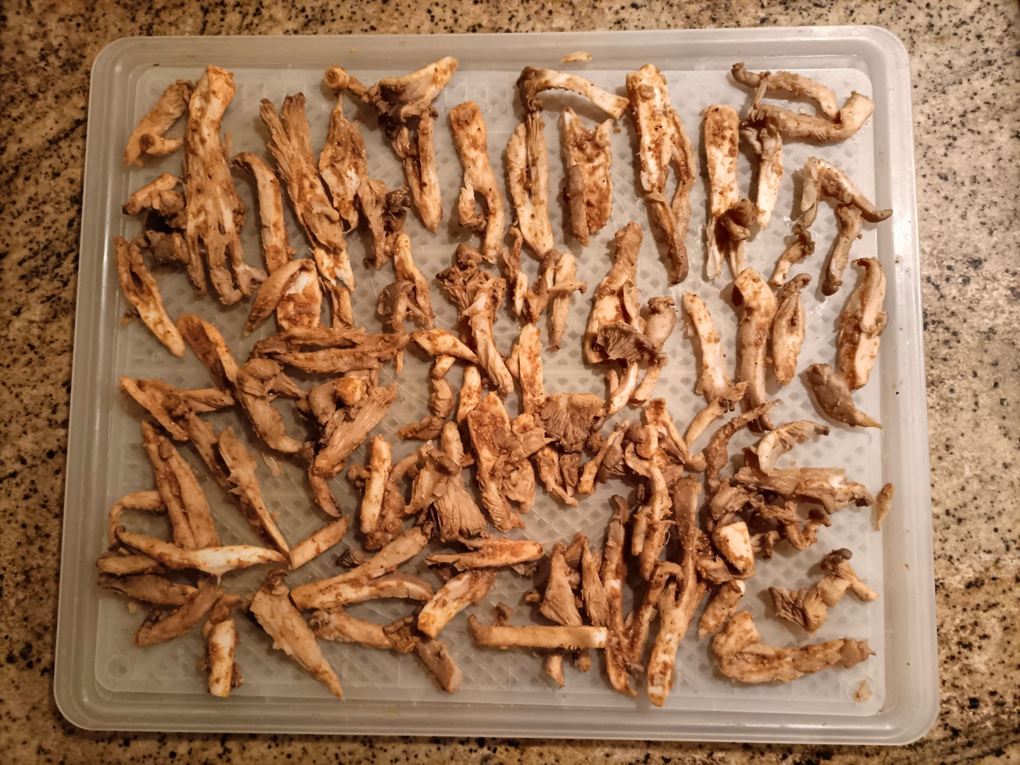 - Leg de oesterzwammen op een tray en droog ze 5 uur in een dehydrator. Keer de reepjes na 2,5 uur. Wanneer je geen dehydrator hebt, hanteer dan je eigen manier om gemarineerde voedingsproducten te verwerken.